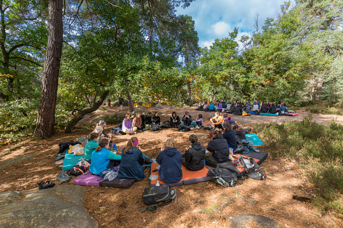 Le lendemain, direction Fontainebleau. Malgré la pluie, la motivation n’a pas faibli. Sous un soleil revenu, les grimpeuses ont retrouvé le grès pour une journée de grimpe en extérieur, guidées par les coachs de la veille, rejoints par Alice Tiounine et Arsène Duval. Pour une vingtaine d’entre elles, c’était même une première fois sur le rocher !